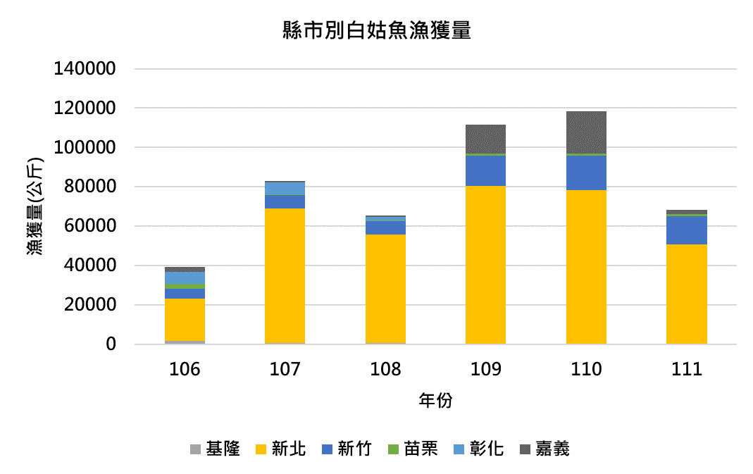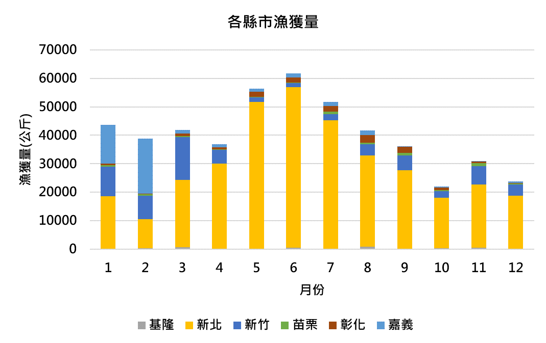 總合歷年個月漁獲量,白姑魚主要漁獲月份為1-7月,以新北捕獲最多,其次為新竹。