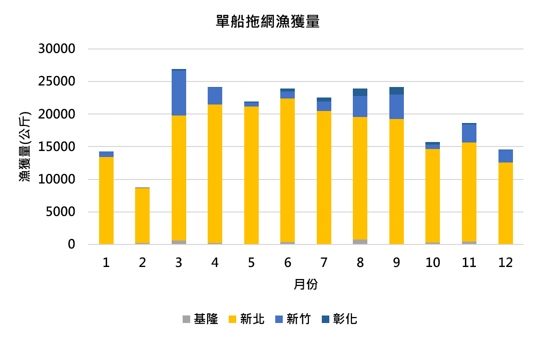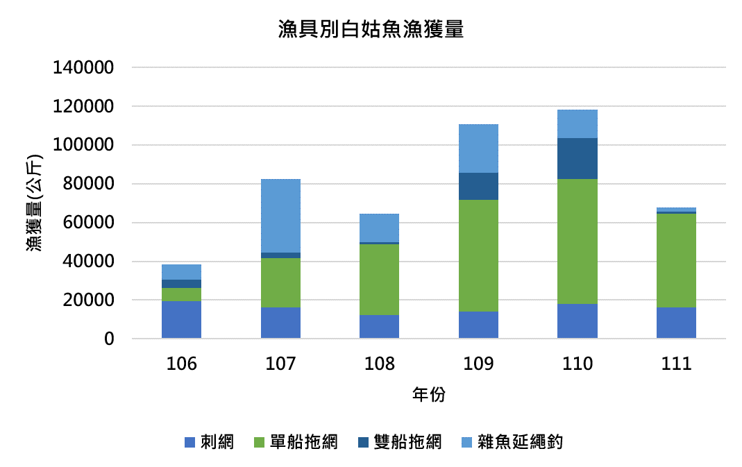 單船拖網為主要捕獲白姑魚的漁法之一,春季至秋季為該漁法主要漁獲月份,新北為該漁法捕獲白姑魚之主要縣市。