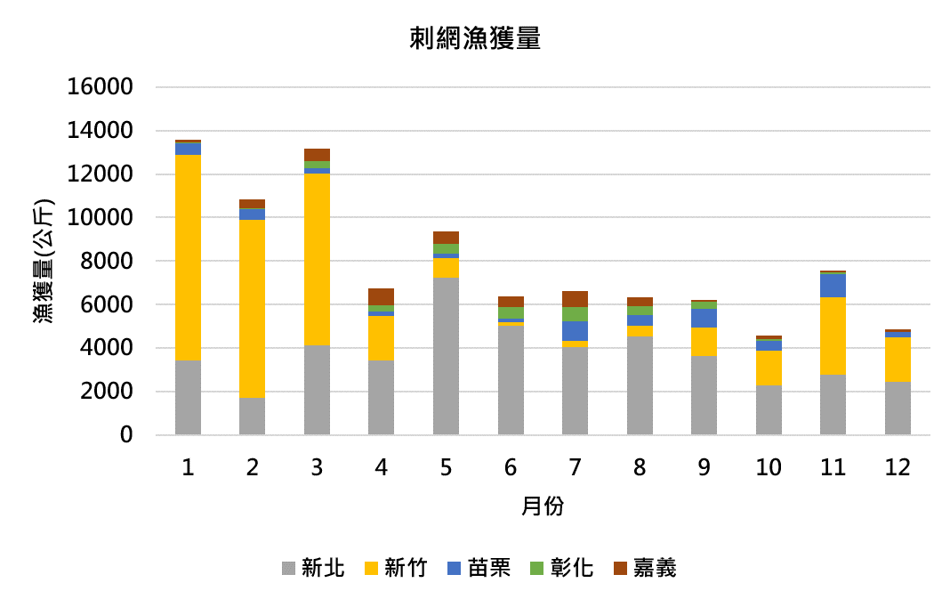 刺網主要於新竹1-3月捕獲白姑魚,新北則主要為5-7月捕獲,新北為該漁法捕獲白姑魚之主要縣市。