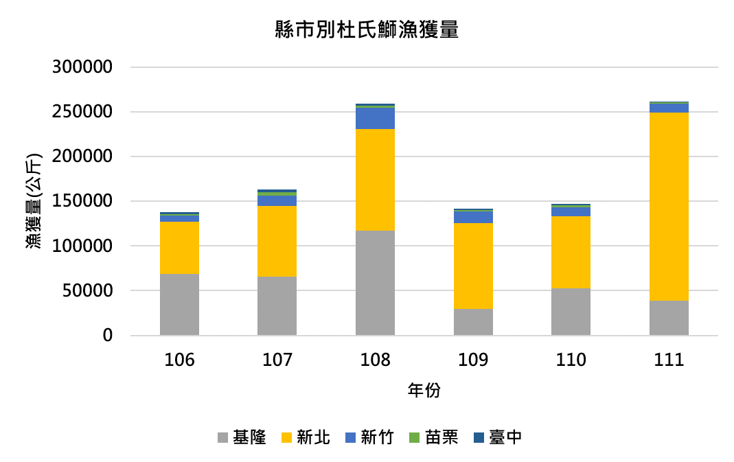 新北在111年杜氏鰤漁獲量有大幅增加的趨勢,漁獲量超過20噸。