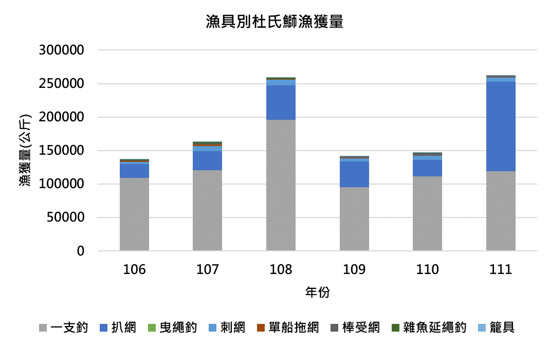 歷年捕獲杜氏鰤以一支釣為主,其次為扒網,其餘則為零星捕獲漁法。