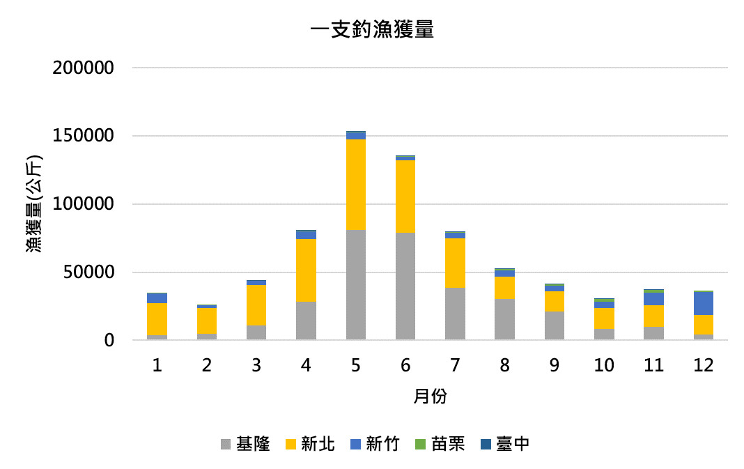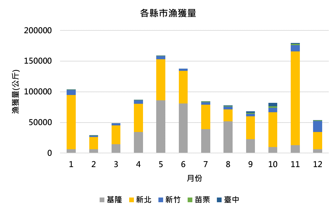 基隆以5-8月捕獲為主,新北每月皆有大量捕獲,其中以11月為最高。