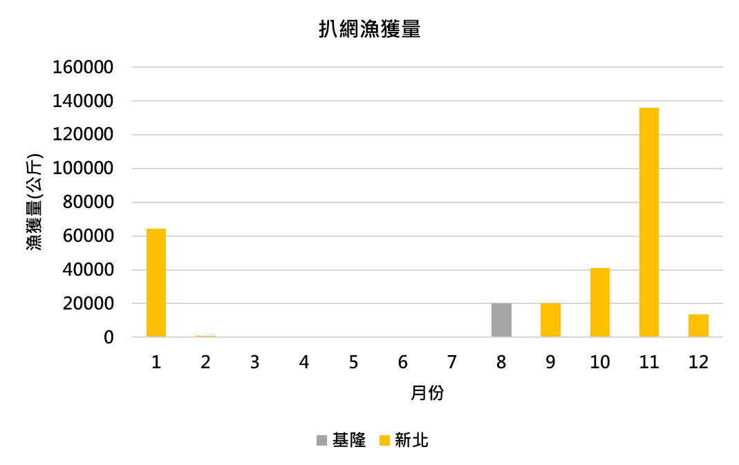 扒網主要於10-11月及1月捕獲杜氏鰤,新北為該漁法捕獲杜氏鰤之主要縣市。