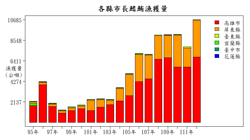 長鰭鮪主要漁獲縣市為高雄市,其次為屏東縣,東部的台東和宜蘭也有少量漁獲記錄,漁獲量在104年之後顯著增加,112年的魚獲量為10,686公噸,其中高雄市的漁獲量為6,816公噸(63.7%),屏東縣的魚獲量為3,840公噸(35.9%),其餘縣市漁獲量為30公噸,僅佔了總漁獲量的0.2%。