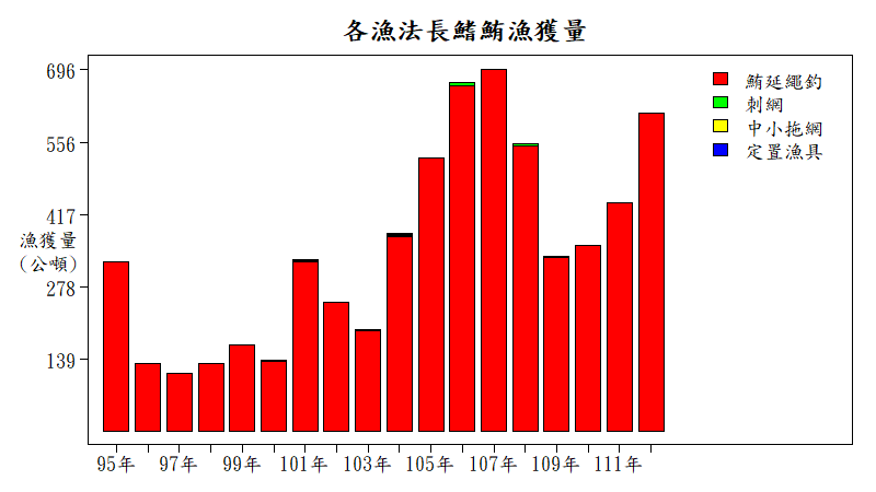 近海鮪延繩釣為台灣沿近海長鰭鮪的主要漁獲管道,99%以上的漁獲量皆來自它,112年近海鮪延繩釣的漁獲量為612.4公噸,其它漁法漁獲量僅有0.7公噸。
