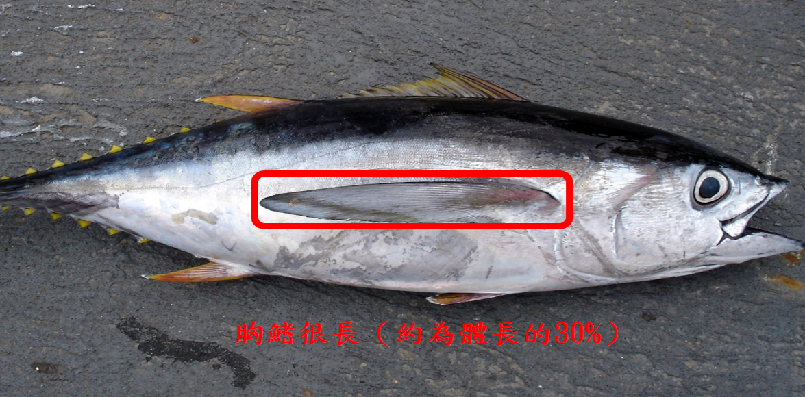 身體為紡錘型利於快速移動,背部為深藍色,腹部為銀白色,最明顯的特徵是長胸鰭,長度可達體長的30%。背鰭、臀鰭和尾鰭通常帶有黃色。